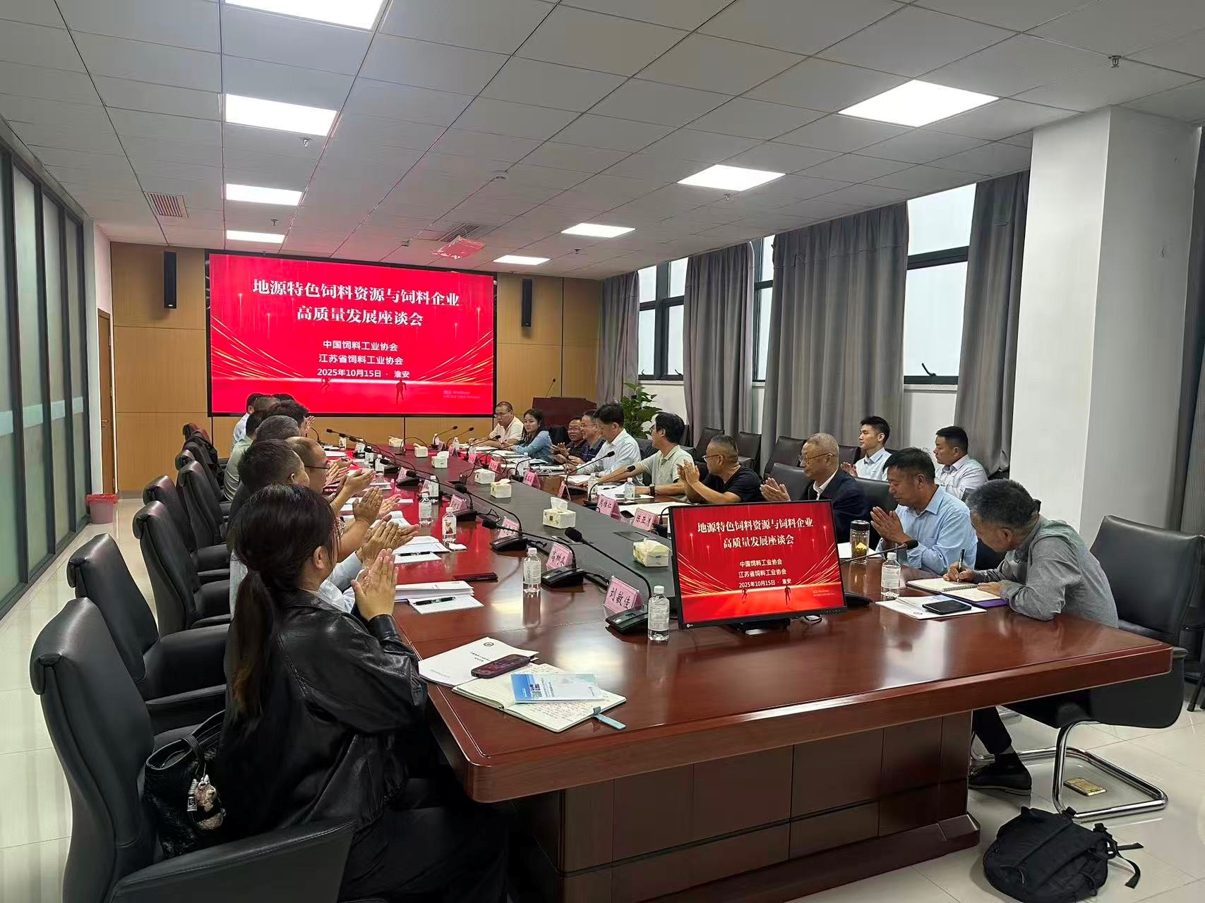 2025年10月15日下午,由农业农村部畜牧兽医局主导、国家饲料工业协会和江苏省农业农村厅委托江苏省饲料工业协会主办的地源特色饲料资源与饲料企业高质量发展座谈会在淮安市饲料行业协会会长单位——淮安天参农牧水产有限公司举行。参加座谈会的中国饲料工业协会副会长兼秘书长秦玉昌、江苏省饲料工业协会秘书长姜加华、常务副会长周维仁,我省饲料界及相关企业代表有江苏安佑、江苏蓝多河生物科技、卫岗乳业、宿迁益客饲料、江苏奥迈实物、江苏汉璟生物、江苏禾丰、大北农江苏区、江苏富海生物科技、连云港益海、淮安天参农牧水产等,与会代表就围绕地源特色饲料资源与饲料企业的高质量发展进程中面临的机遇和挑战等课题进行了深入的交流,以期精准把握大中小型饲料企业的发展脉搏,厘清我省地源特色饲料原料的种类、区域分布、资源存量、饲用价值和卡法利用情况,探讨饲料企业发展基本情况以及生产经营、科技创新与研发能力、绿色发展与可持续发展、面临的挑战与未来规划、需求和建议等,取得了有益的共识。